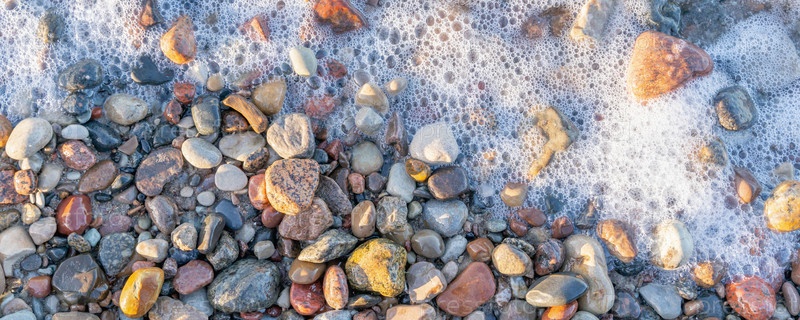 Морская пена на мокрой гальке на пляже в солнечный день, крупным планом