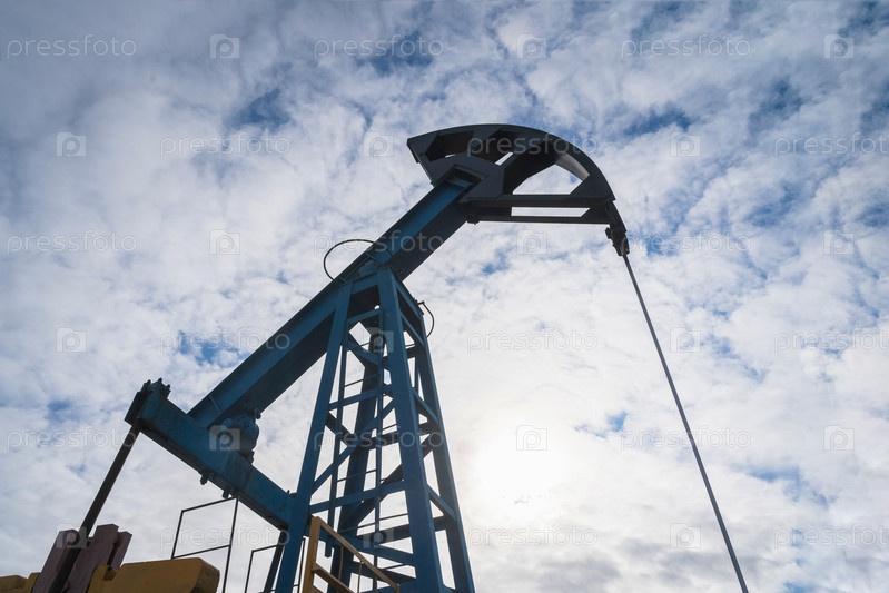 Масляный насос на фоне голубого неба и утреннего солнца, солнечные блики на масляном насосе