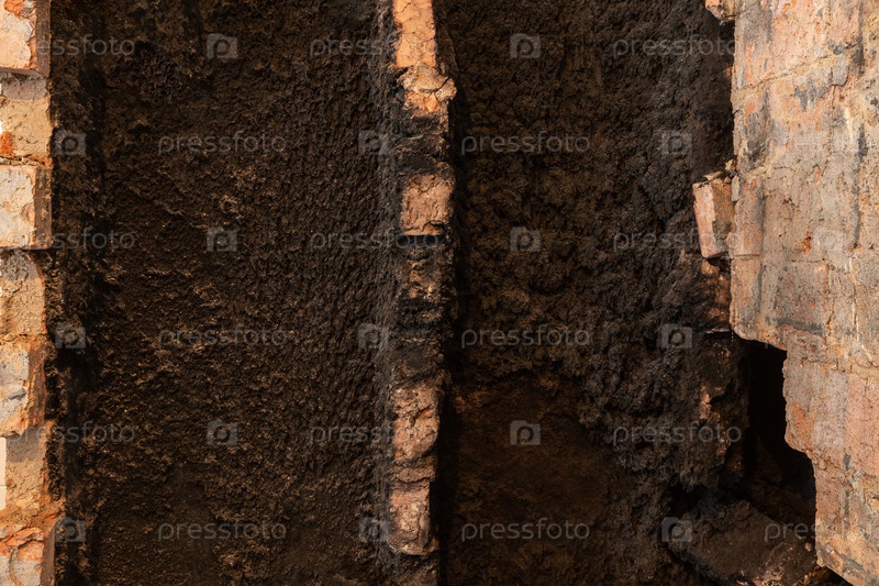 Демонтаж старой кирпичной печи. Черная сажа внутри колодцев печи. Грязная и пыльная работа во время ремонта дома. Концепция разрушения после пожара