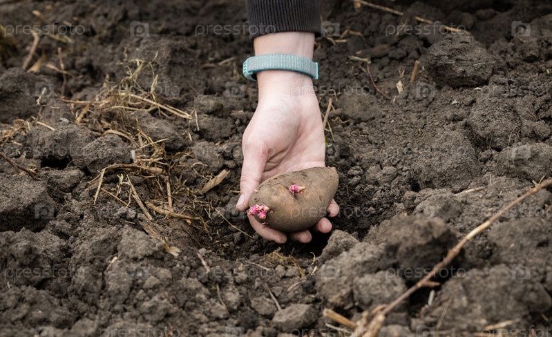 Посадка семенного картофеля в почву. Овощной клубень в женской руке. Фермер кладет картофель с ростками в яму, выкопанную для посадки