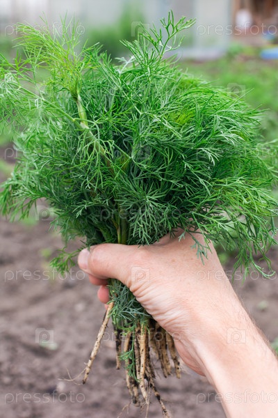 Свежий пучок зеленого укропа в мужской руке, собранный в саду. Выращивание зелени на открытом воздухе