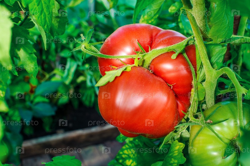 Красный спелый помидор на ветке. Выращивание овощей в теплицах или на открытом воздухе. Урожай