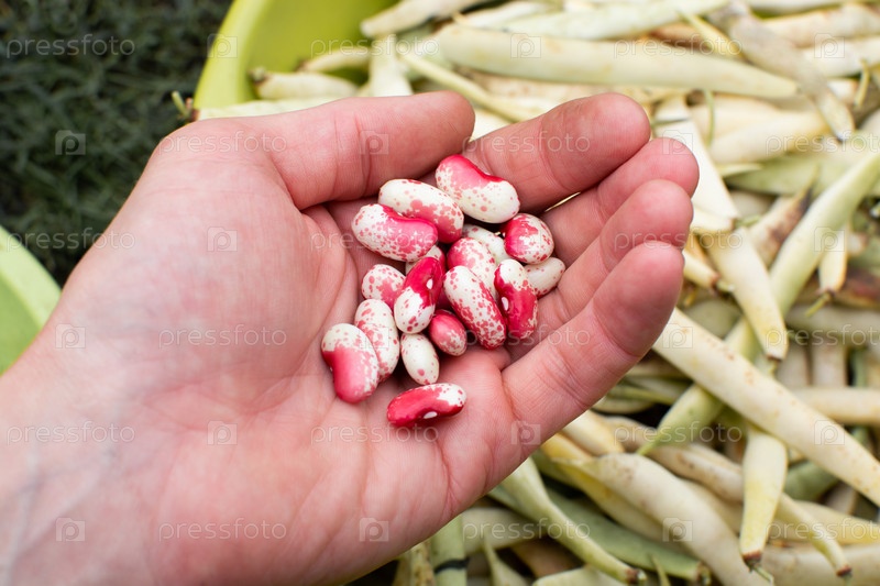 Свежие бобы в мужской руке. Сбор урожая. Семена из созревших стручков. Растение семейства бобовых