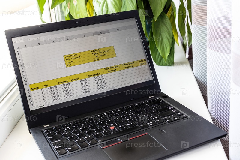 Снимок листа Excel на экране компьютера, показывающий таблицу амортизации банковского кредита