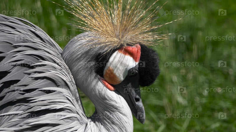 Красивая птица, серый венценосный журавль с голубыми глазами и красным плетнем
