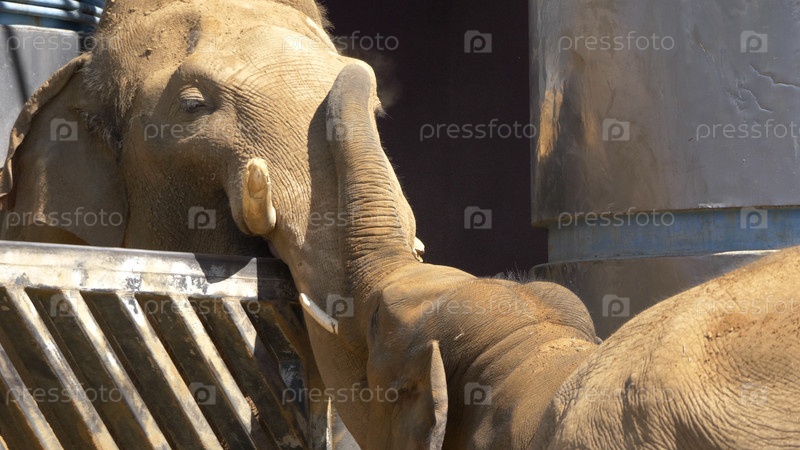 МОСКВА - 27 СЕНТЯБРЯ: 27 сентября 2019 года в Москве, Россия, гуляют азиатская слониха-мать и детеныш Московского зоопарка