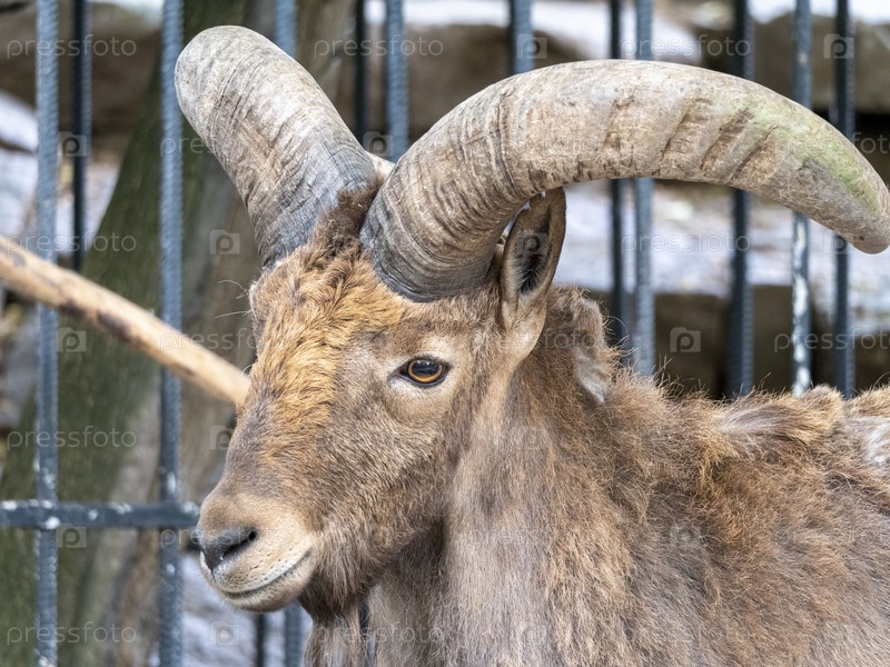 Красивый горный козел со спиральными длинными рогами на фоне скал