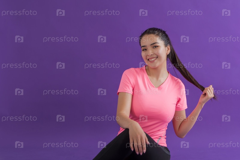 Девушка 25-30 лет со спортивной фигурой позирует в студии