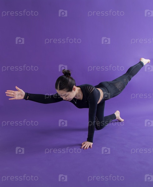 Фитнес-девушка выполняет спортивные упражнения на фиолетовом фоне