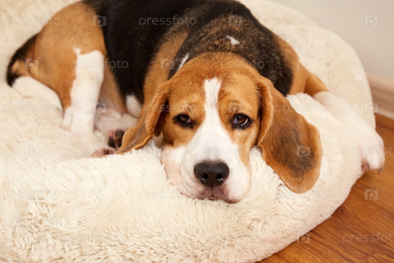 Собака бигль лежит на собачьей подстилке