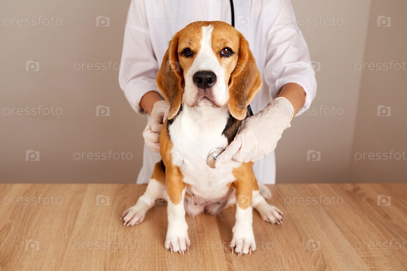 Ветеринарный врач осматривает собаку-бигля с помощью стетоскопа
