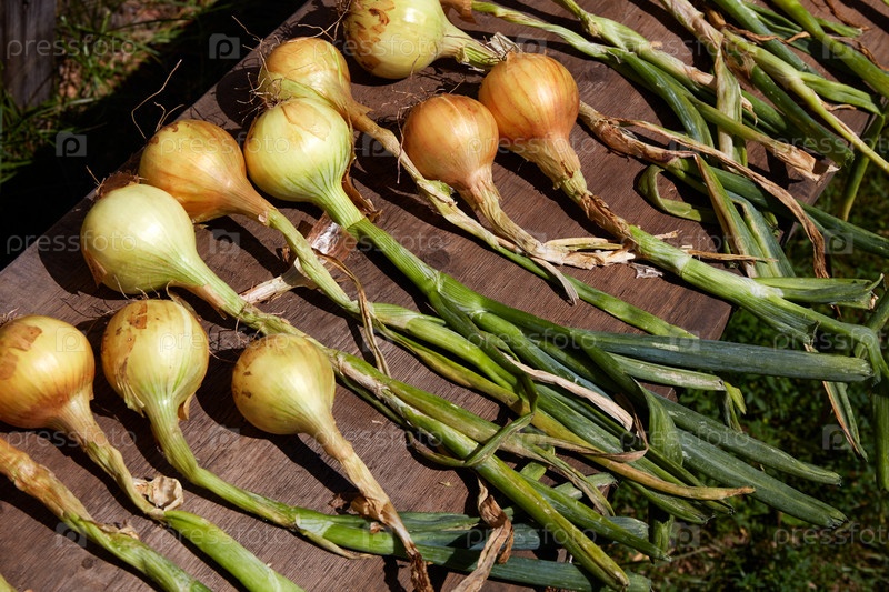 Урожай лука сушат на деревянных досках. Время сбора овощей