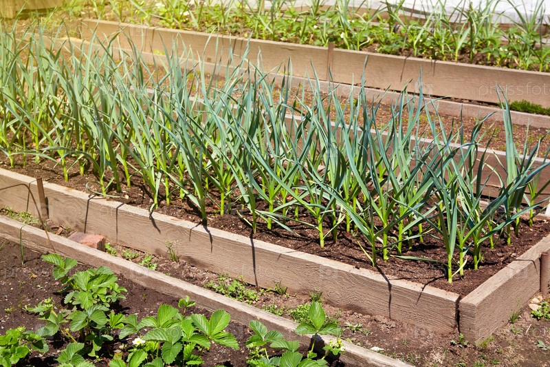 Органический огород. Грядка из молодых побегов чеснока, клубники