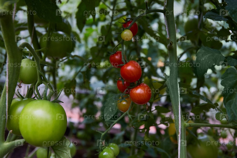 Кусты зеленых и спелых помидоров. Выращивание органических томатов в домашней теплице