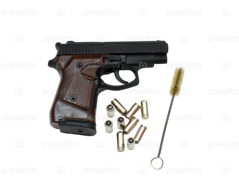9-миллиметровые пистолетные пули и пистолет изолированы на белом фоне