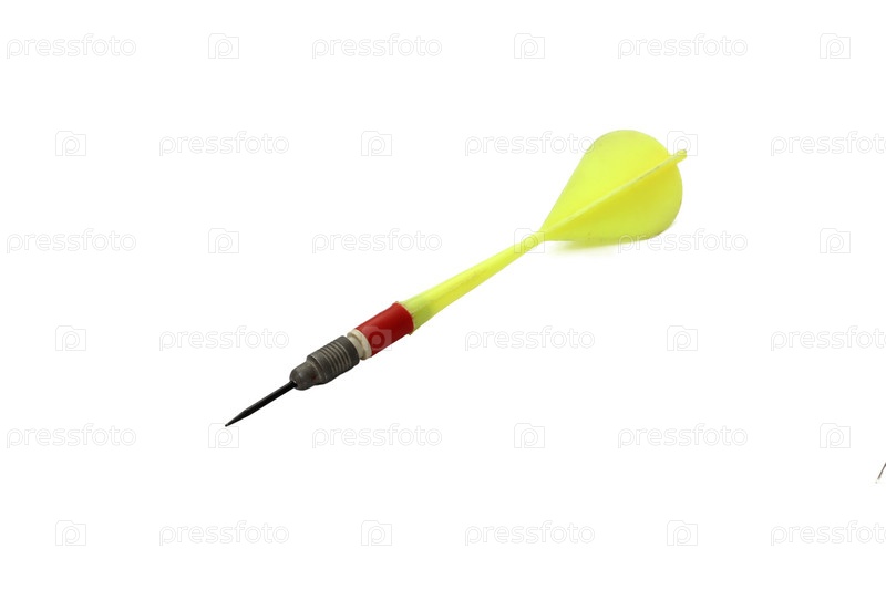 Желтый дротик застрял в пластиковых перьях, изолированных на белом фоне