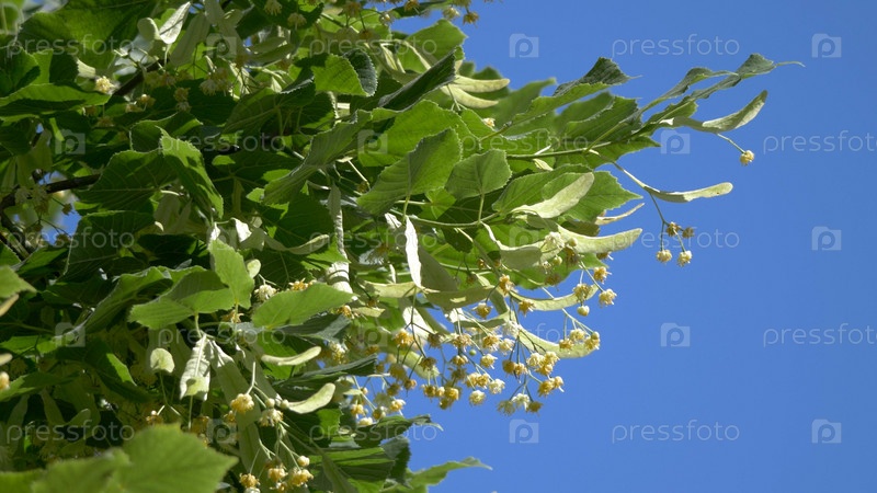 Цветы липы на фоне голубого неба в солнечный день