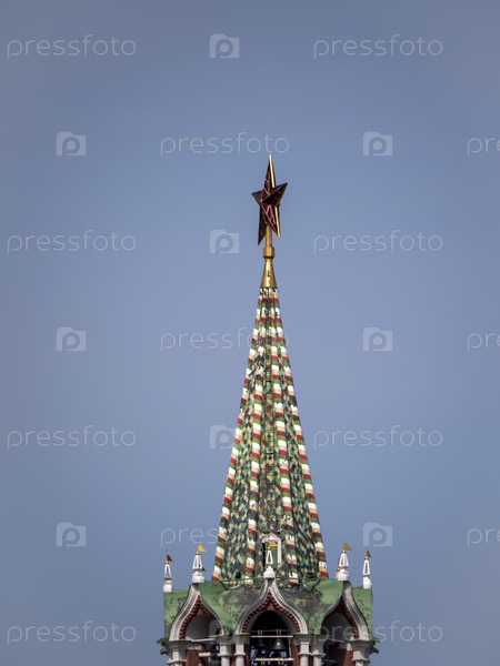 МОСКВА, РОССИЯ, 10 июня 2019 г.: Рубиновая звезда на шпиле Спасской башни Московского Кремля 10 июня 2019 г. в Москве, Россия