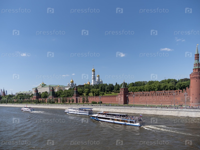 МОСКВА, РОССИЯ - 22 мая 2022 года: Вид на Московский Кремль со стороны Москвы-реки. Башни из красного кирпича и колокольня Ивана Великого