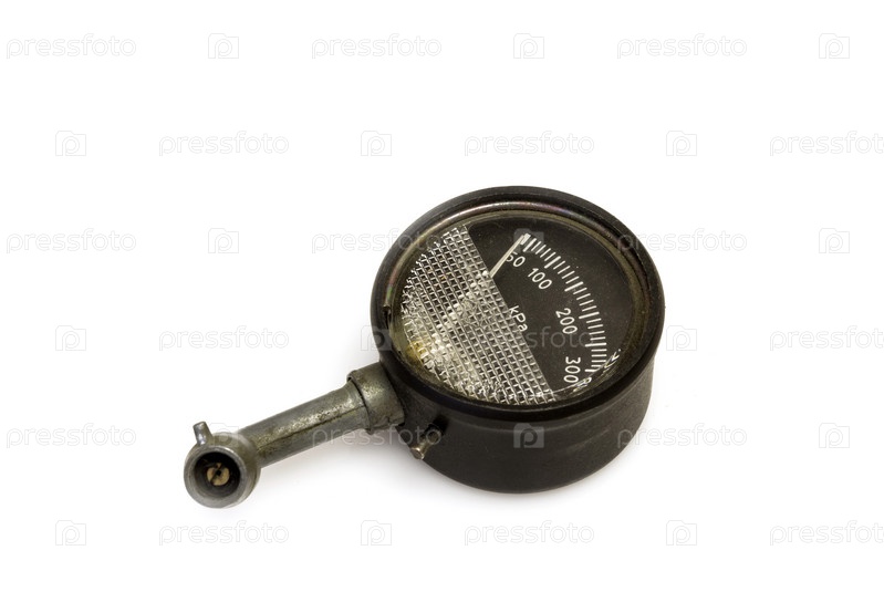 Ручной манометр для измерения давления воздуха в автомобильных шинах на белом фоне