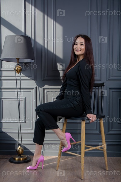 Девушка в темной одежде позирует в студии на темном фоне