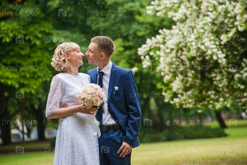 Молодожены целуются на фотосессии в парке