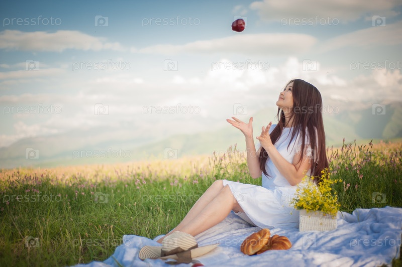Девушка азиатской национальности, кыргызка, позирует на пикнике в горной местности на природе в белом платье