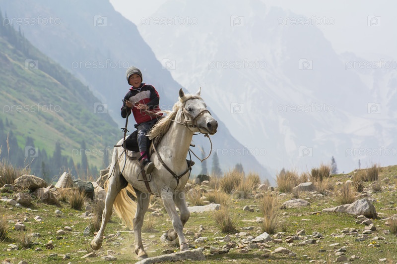 7-летний кыргызский мальчик катается на лошади в горах Кыргызстана