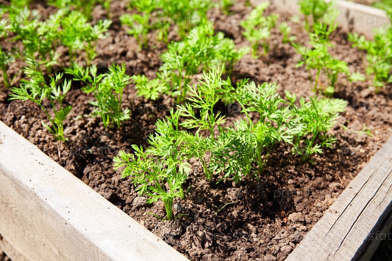 Ростки моркови в почве. Овощная грядка из молодой моркови