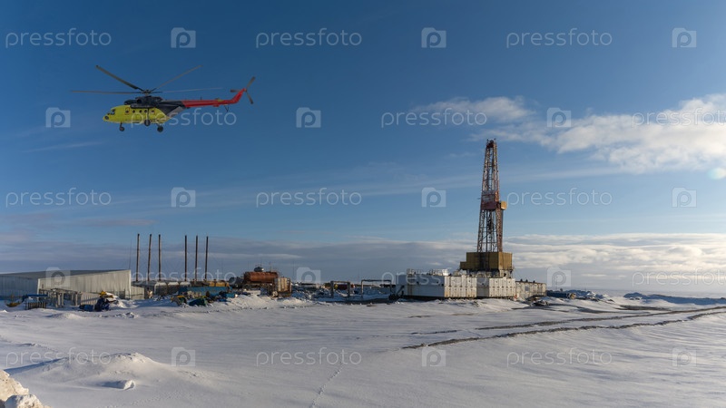 Буровая вышка и инфраструктура бурения скважин на северном нефтегазовом месторождении. Полярная снежная зима. Желтый вертолет с бурильщиками. Ясное голубое небо. Коллаж