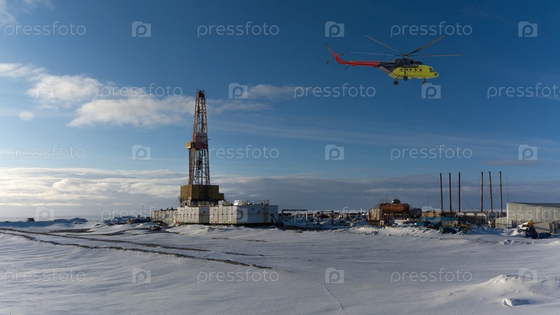 Буровая вышка и инфраструктура бурения скважин на северном нефтегазовом месторождении. Полярная снежная зима. Желтый вертолет с бурильщиками. Ясное голубое небо. Коллаж