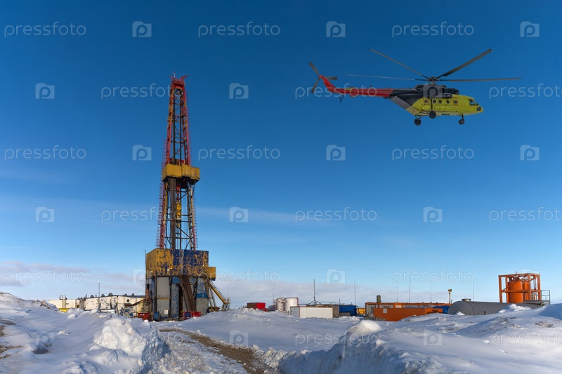 Буровая вышка и инфраструктура бурения скважин на северном нефтегазовом месторождении. Полярная снежная зима. Желтый вертолет с бурильщиками. Ясное голубое небо. Коллаж