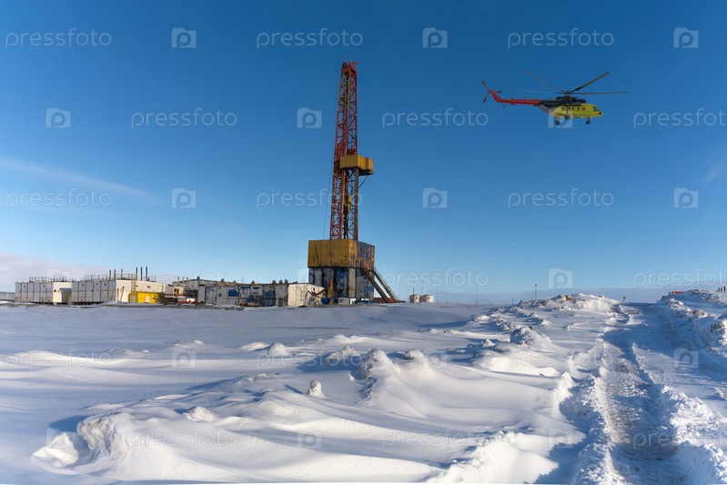 Буровая вышка и инфраструктура бурения скважин на северном нефтегазовом месторождении. Полярная снежная зима. Желтый вертолет с бурильщиками. Ясное голубое небо. Коллаж