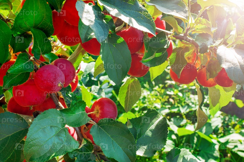 Красные спелые яблоки на ветке. Яблоня в саду. Мелкие фрукты
