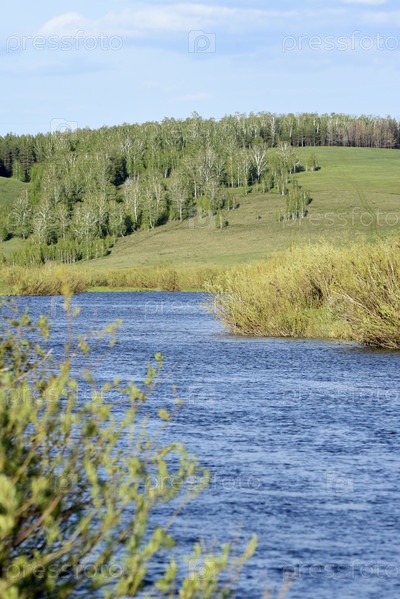 Голубая вода весенней реки на фоне зеленых холмов. Горная река весной