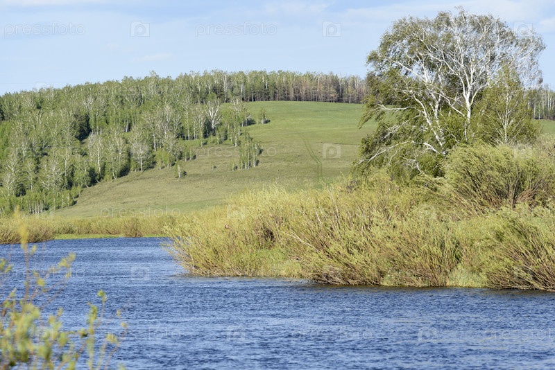 Голубая вода весенней реки на фоне зеленых холмов. Горная река весной