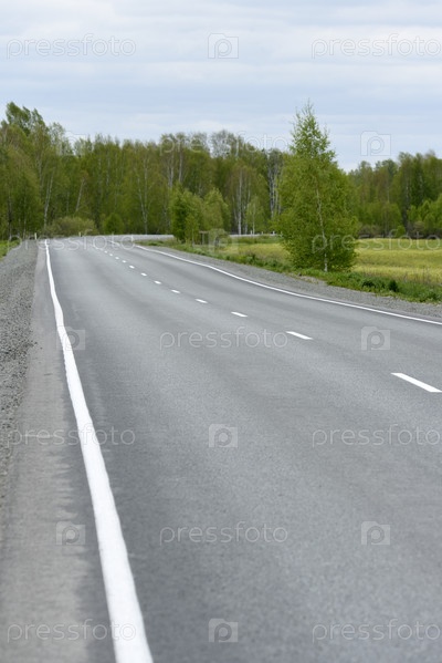 Высокоскоростная асфальтированная дорога в весеннем лесу. Проселочная дорога