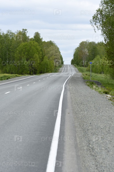 Высокоскоростная асфальтированная дорога в весеннем лесу. Проселочная дорога