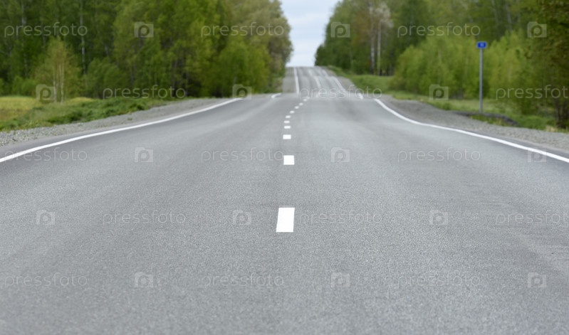 Высокоскоростная асфальтированная дорога в весеннем лесу. Проселочная дорога