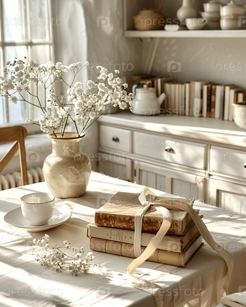 Стопка старых книг, перевязанных белой тканевой лентой, лежит на светлом столе на кухне в стиле Прованс, День книголюбов