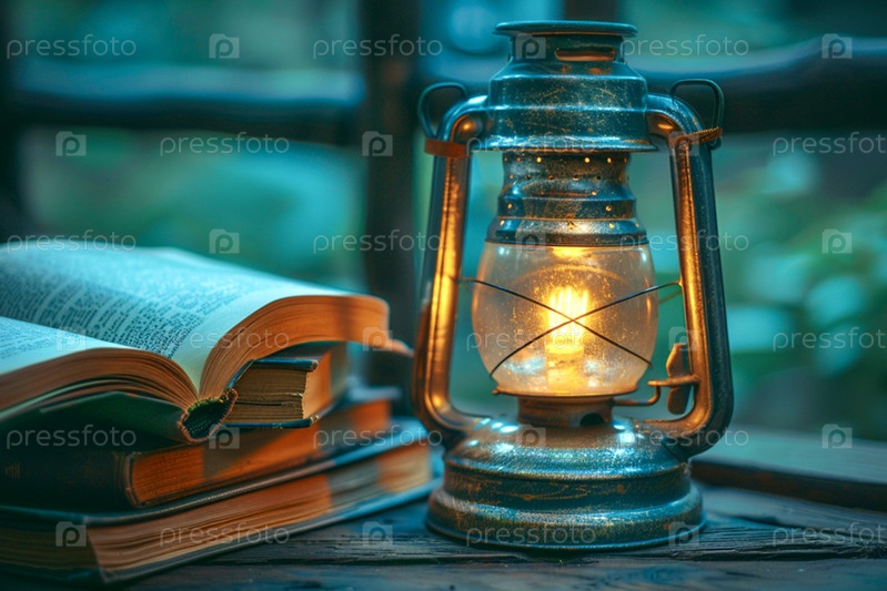 Фонарь с теплым светом стоит на столе возле окна, рядом книги, Всемирный день книги