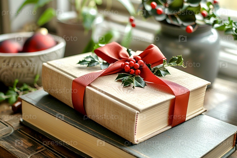 Новая бежевая книга, перевязанная красной подарочной лентой, лежит на кухонном столе, книга в подарок ко Дню книголюбов