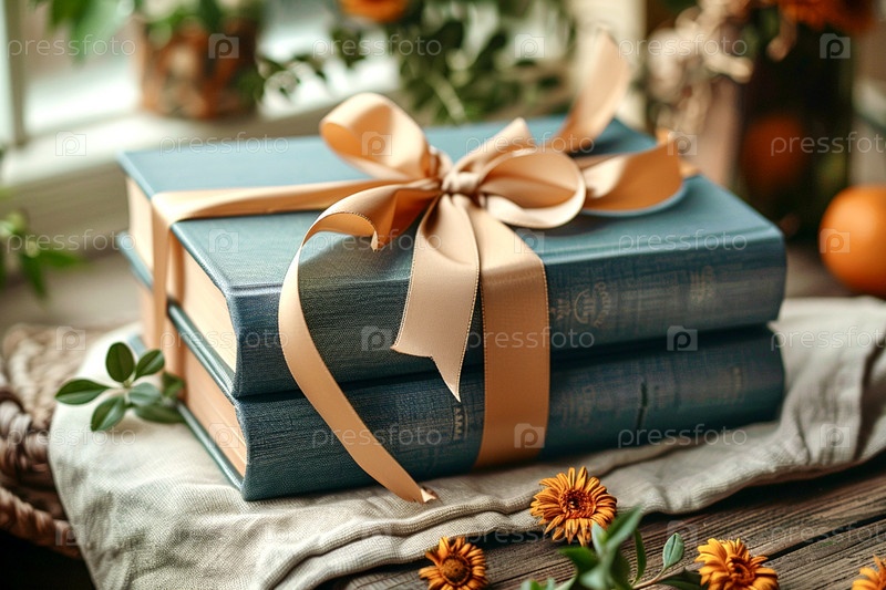 Две новые книги, перевязанные персиковой подарочной лентой, лежат на столе на кухне, подарок ко Дню книголюбов