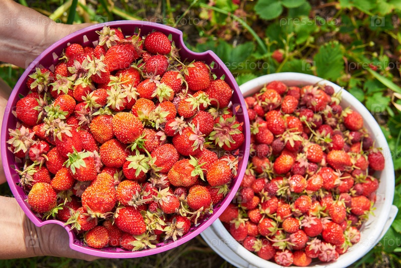 Ягодный сезон. Яркие красочные ведра с клубникой на зеленой траве