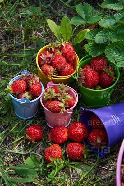 Куча клубники стоит в ряду маленьких ведер. Ведерки разного цвета, а клубника красная. Концепция изобилия и свежести, поскольку клубника созрела