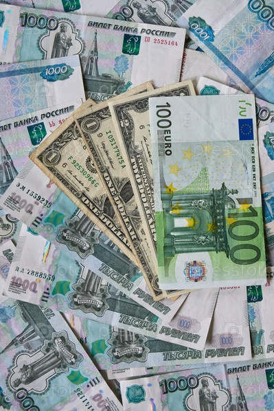 Фон бумажных купюр долларов, евро и рублей. Курс обмена валют