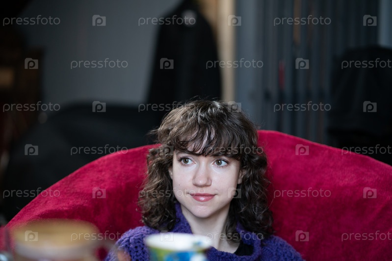 Молодая красивая женщина сидит в красном кресле
