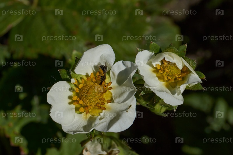Цветы клубники на фоне листьев и земли. В саду цветет клубника