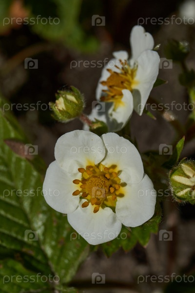 Цветы клубники на фоне листьев и земли. В саду цветет клубника