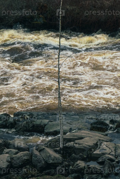 Одинокая береза на фоне бушующих потоков воды в реке около гидроэлектростанции Ляскеля в Карелии